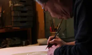 扇子は87回職人の手を通るといわれます。その工程は20余りに分かれています。大別すると扇骨作り、扇面作り、扇骨と扇面を組み合わせる仕上げ作業ですが、時代とともに職人の確保が難しくなっています。宮脇賣扇庵は、優れた職人とその技術を確保し、技術継承へ熱意をもって取り組んでいます。