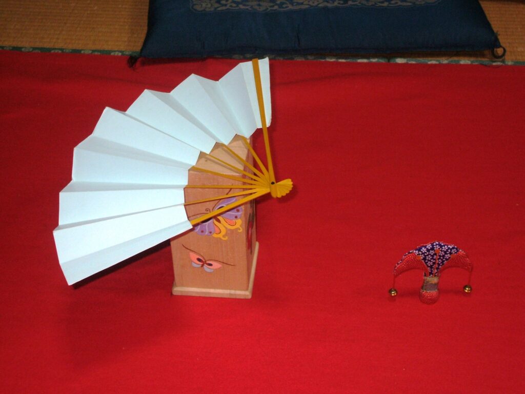 A wooden stand holds a small fan-shaped target called the chō (“butterfly”).